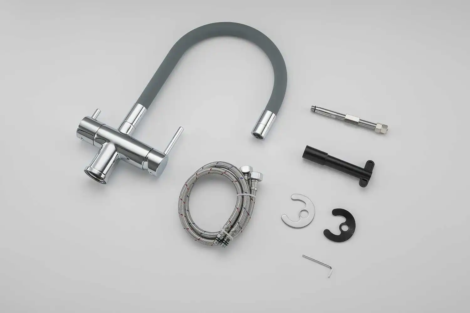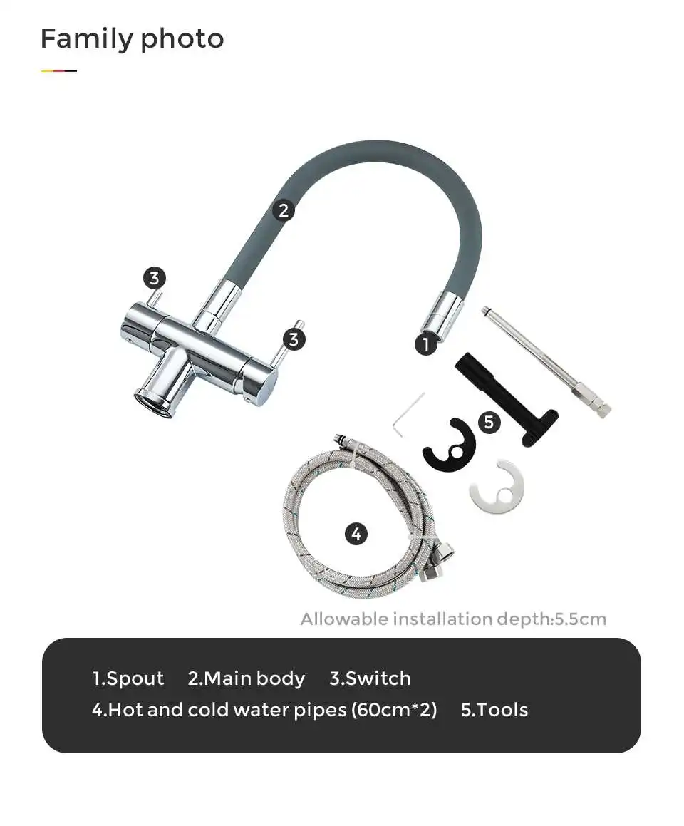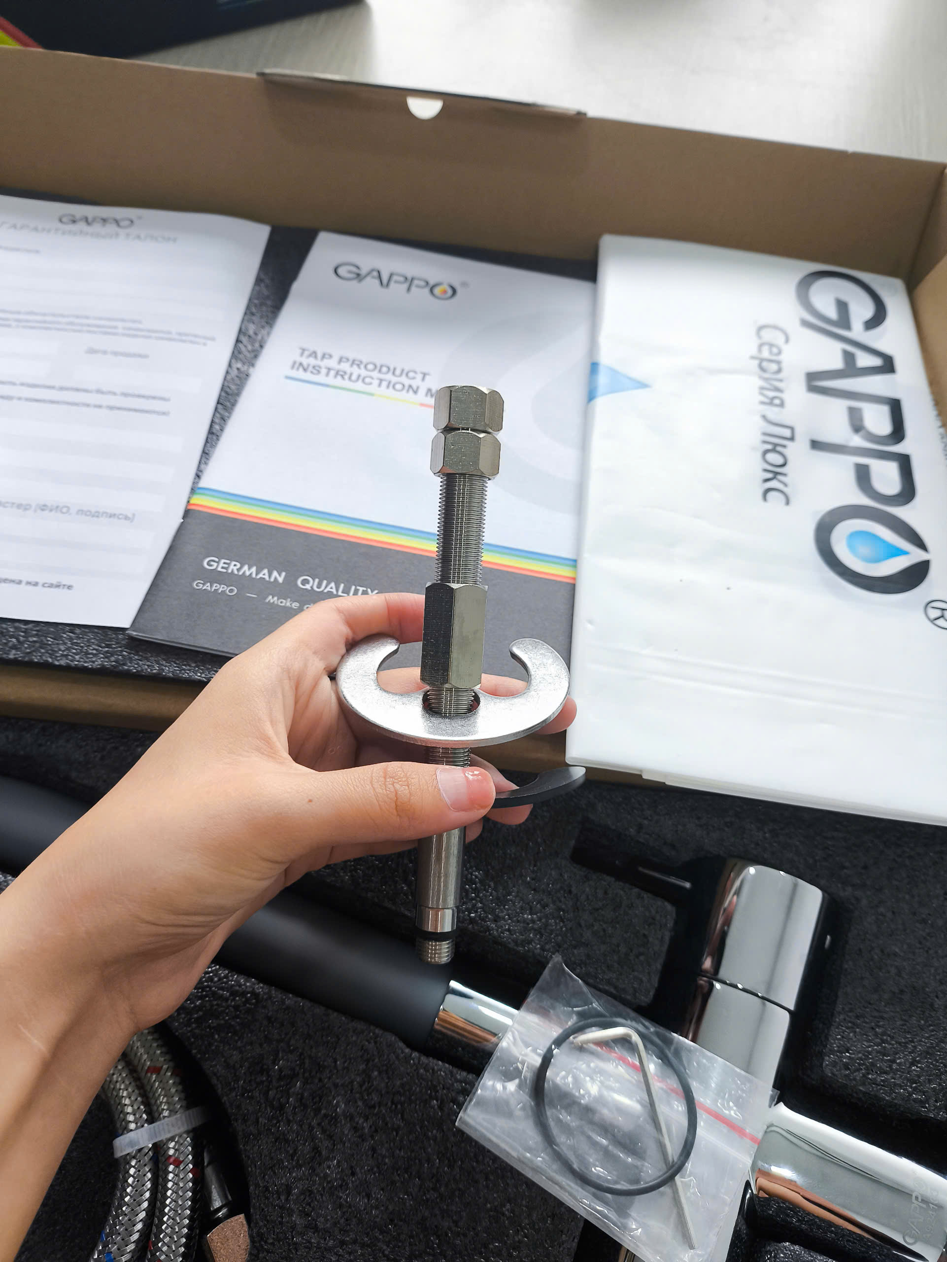 Phụ kiện gồm : Thân vòi, sách hướng dẫn, thẻ bảo hành, dây cấp nóng lạnh , phụ kiện lắp đặt